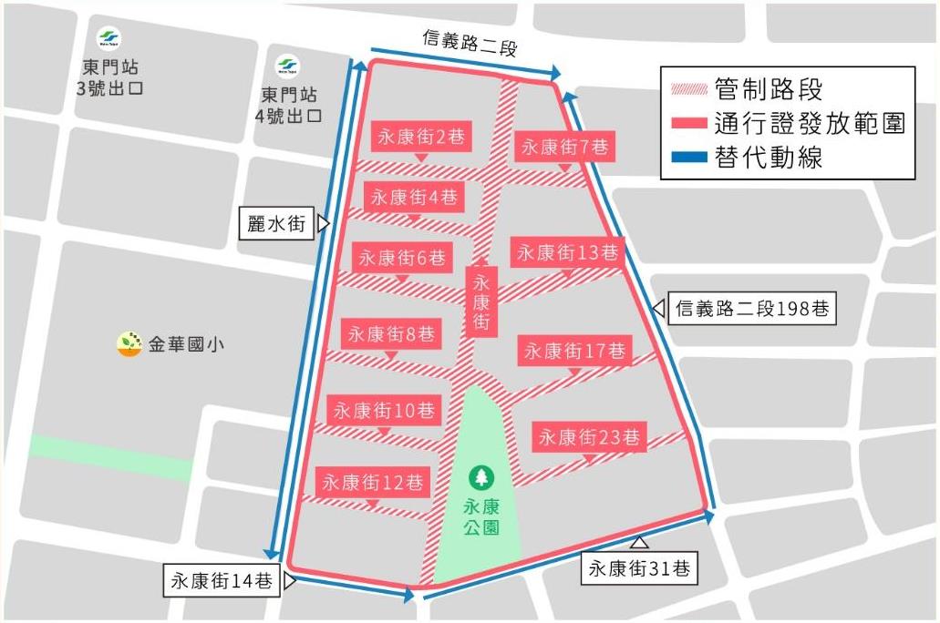 一、 永康街周邊(北起信義路2段、南迄永康街14巷及31巷口、西起麗水街、東迄信義路2段198巷)(如圖1)。