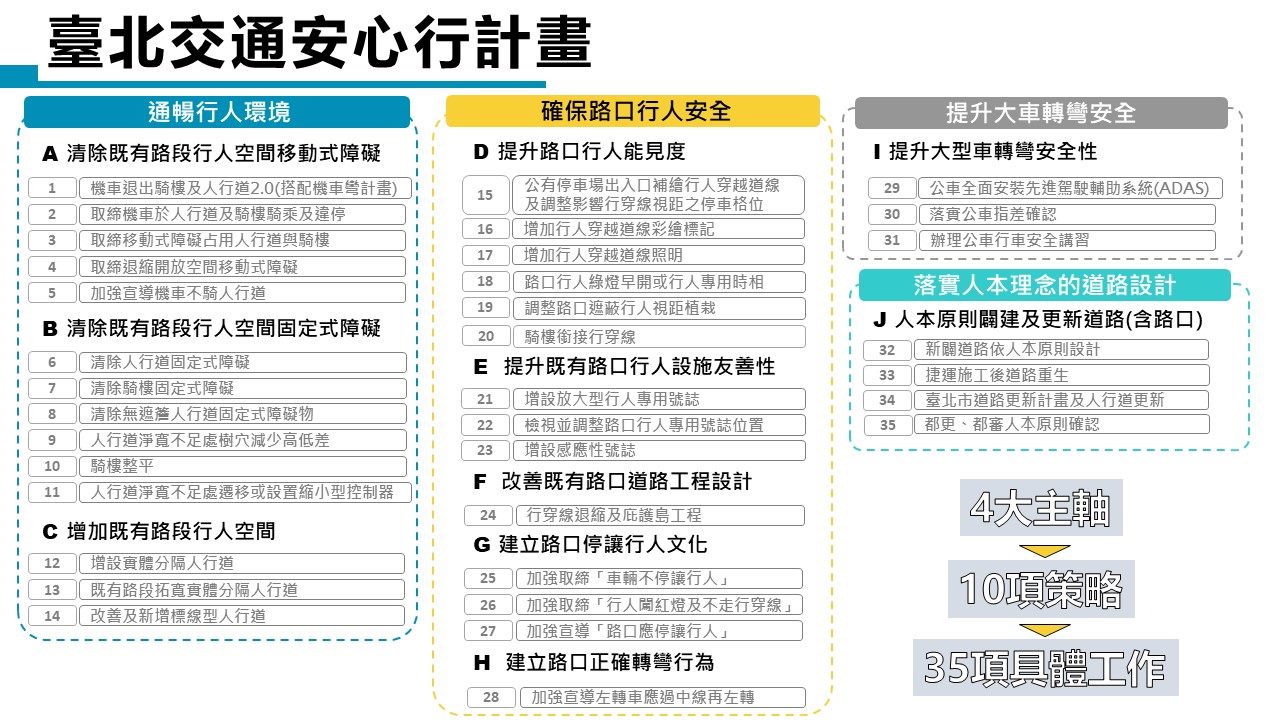 「道安」攸關每位國人行的安全,為給行人安全的用路環境,政府自106年起推動前瞻基礎建設等計畫,至111年止,共完成357公里人行道的建置、改善1,331處路口、排除1,571處障礙物、騎樓整平295公里。惟據交通部統計,112年1-3月行人交通事故死亡人數超過百人,為貫徹改善行人交通政策的決心,行政院同年5月25日通過「行人優先交通安全行動綱領」報告,從工程、教育、監理及執法4大面向,推動19項行動方案,結合跨部會與地方政府力量,完善行人通行環境、建立國人正確用路觀念,同時加強取締路口不停讓行人之行為,把行人優先的人本交通觀念,養成為道路駕駛者的習慣。