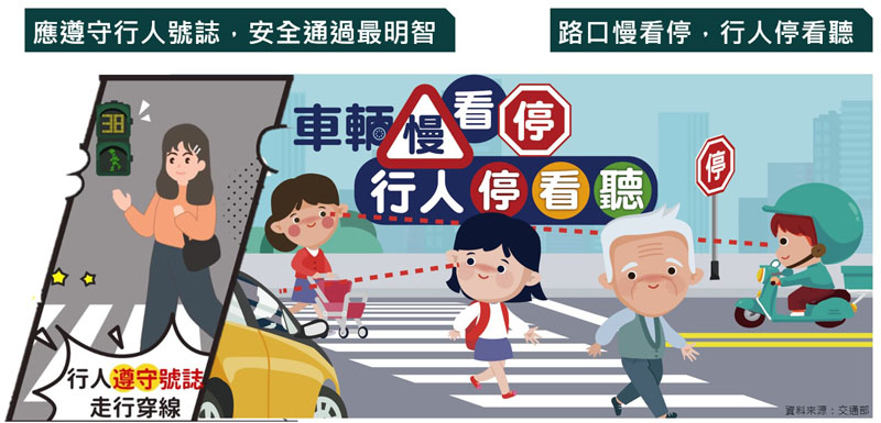 「道安」攸關每位國人行的安全,為給行人安全的用路環境,政府自106年起推動前瞻基礎建設等計畫,至111年止,共完成357公里人行道的建置、改善1,331處路口、排除1,571處障礙物、騎樓整平295公里。惟據交通部統計,112年1-3月行人交通事故死亡人數超過百人,為貫徹改善行人交通政策的決心,行政院同年5月25日通過「行人優先交通安全行動綱領」報告,從工程、教育、監理及執法4大面向,推動19項行動方案,結合跨部會與地方政府力量,完善行人通行環境、建立國人正確用路觀念,同時加強取締路口不停讓行人之行為,把行人優先的人本交通觀念,養成為道路駕駛者的習慣。