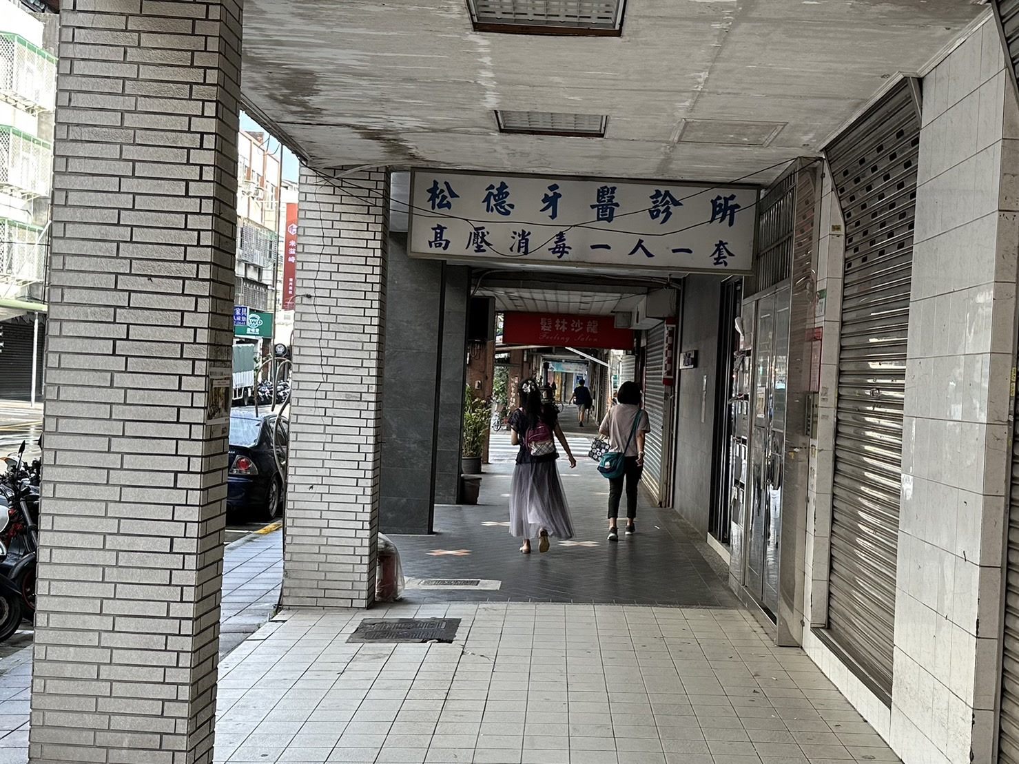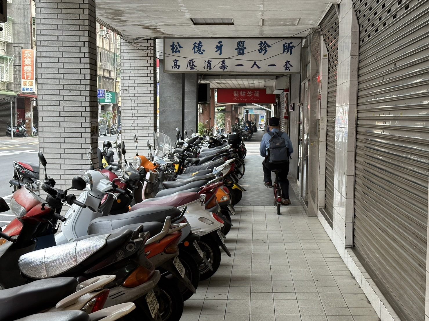 機車停放於騎樓內,有人車交織狀況