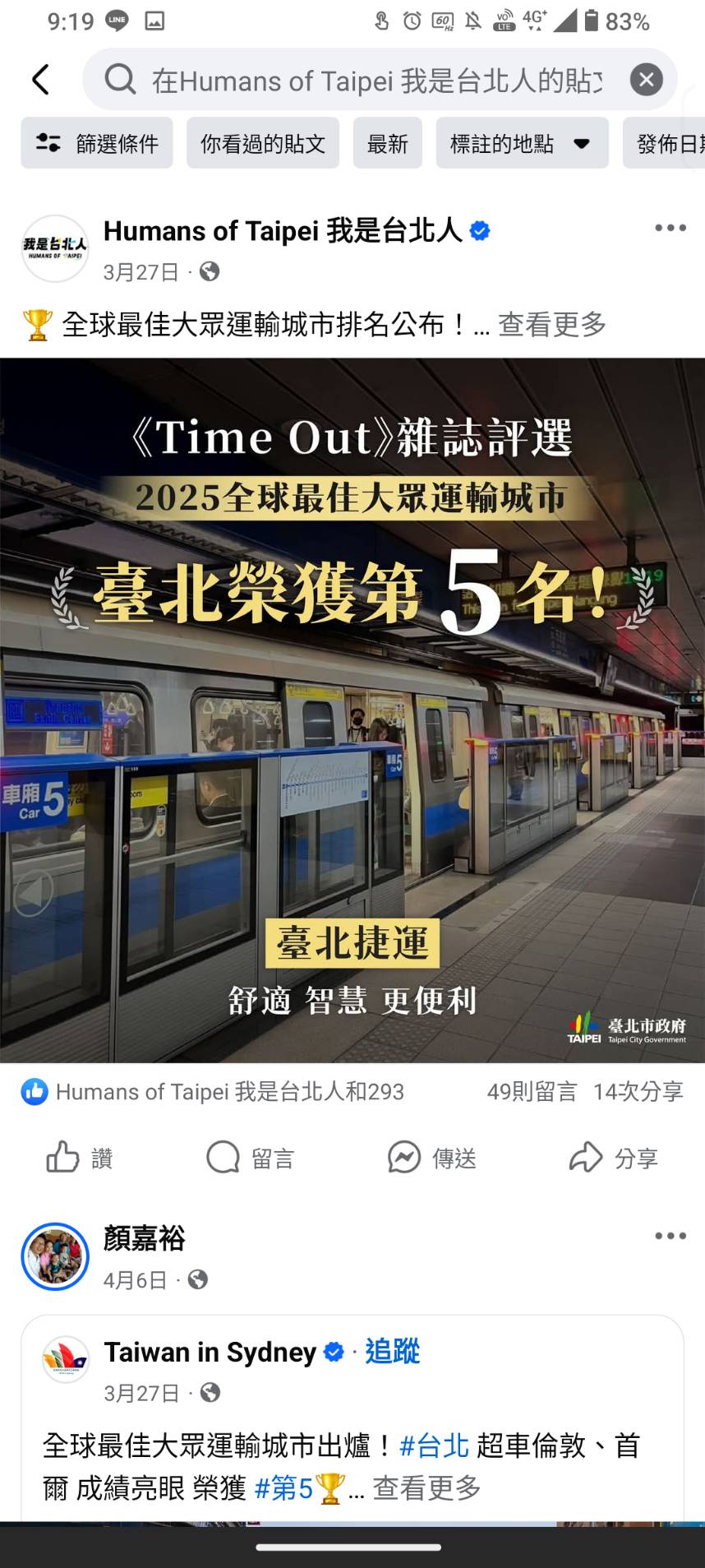 市府LINE官方帳號發布 - 0328 2025全球最佳大眾運輸城市-臺北榮獲第5名 -