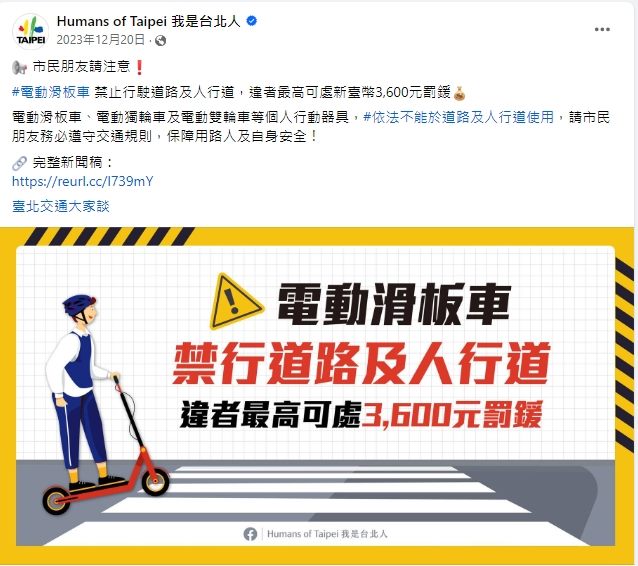 我是台北人FB發布 - 電動滑板車 禁止行駛道路及人行道 -